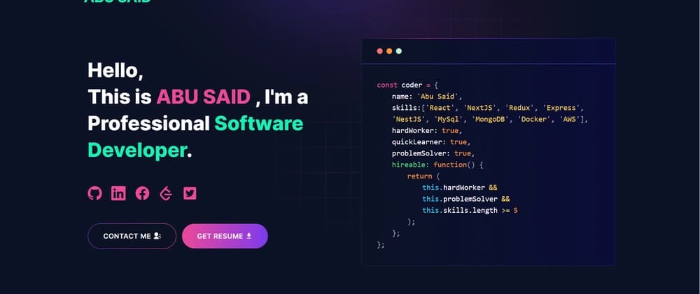 constcoder={name:'Abu Said',skills:['React', 'NextJS', 'Redux', 'Express', 'NestJS', 'MySql', 'MongoDB', 'Docker', 'AWS'],hardWorker:true,quickLearner:true,problemSolver:true,hireable:function() {return(this.hardWorker&&this.problemSolver&&this.skills.length>=5);};};Who I am?